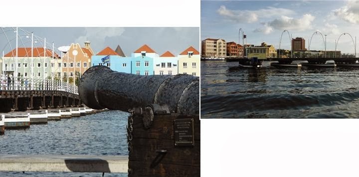 | Willemstad straddles the entrance to the Schottegat, a well protected natural harbour. Pedestrians cross via the amazing Queen Emma Pontoon Bridge, which pivots open and shut to allow ship traffic to pass. It's shown here shut and opening. |